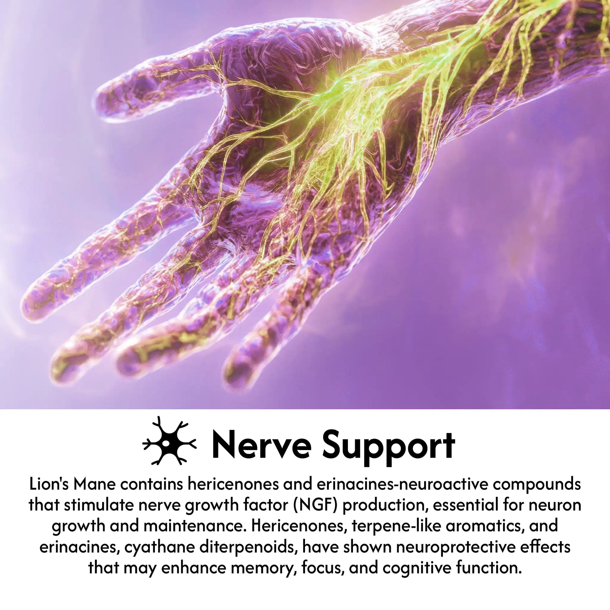 Lion's Mane contains hericenones and erinacines-neuroactive compounds that stimulate nerve growth factor (NGF) production, essential for neuron growth and maintenance. Hericenones, terpene-like aromatics, and erinacines, cyathane diterpenoids, have shown neuroprotective effects that may enhance memory, focus, and cognitive function.