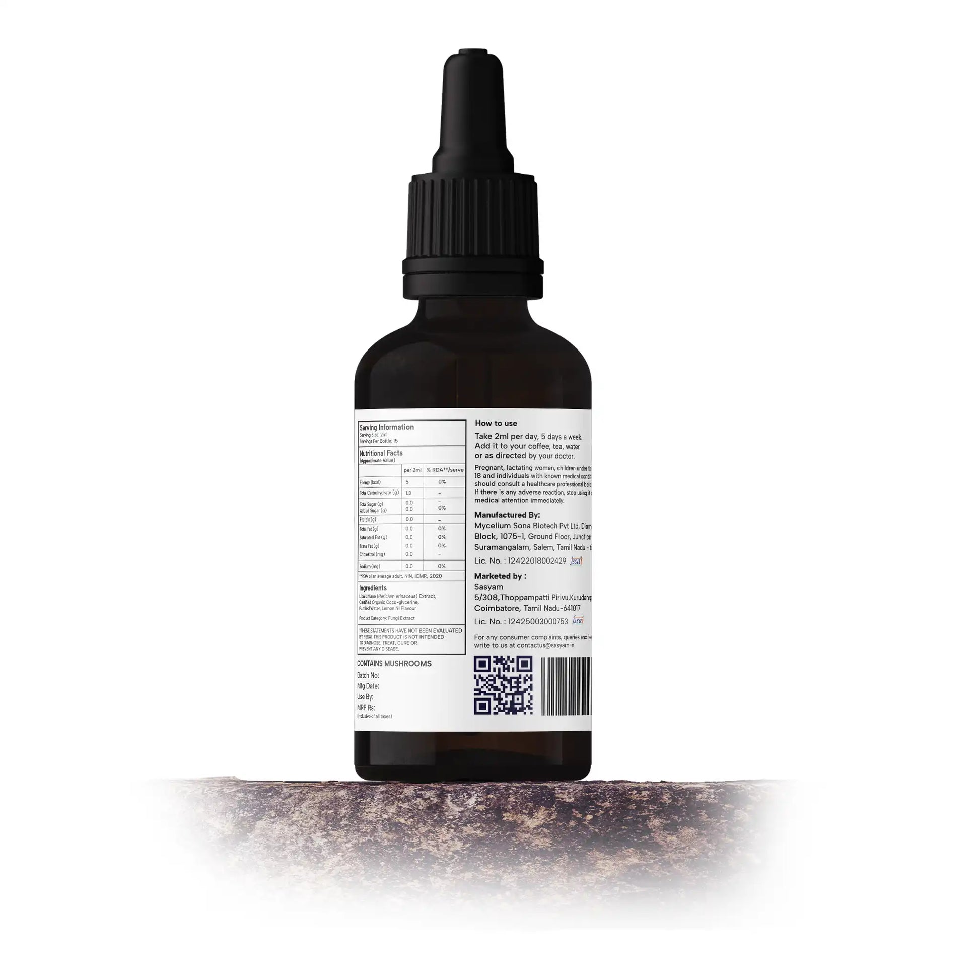 Using purified water and organic food-grade glycerine, the mycelium undergoes a dual-extraction process along with dried fruitbodies. The resulting liquid extract is then filtered and centrifuged.